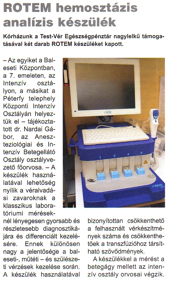 Nagy örömünkre szolgál, hogy 2015. március 10-én kedden a Péterfy Sándor utcai Kórház vértakarékos és vérmentes gyógyító munkáját két darab használatra kihelyezett ROTEM véralvadás analizátor készülékkel is támogathattuk.